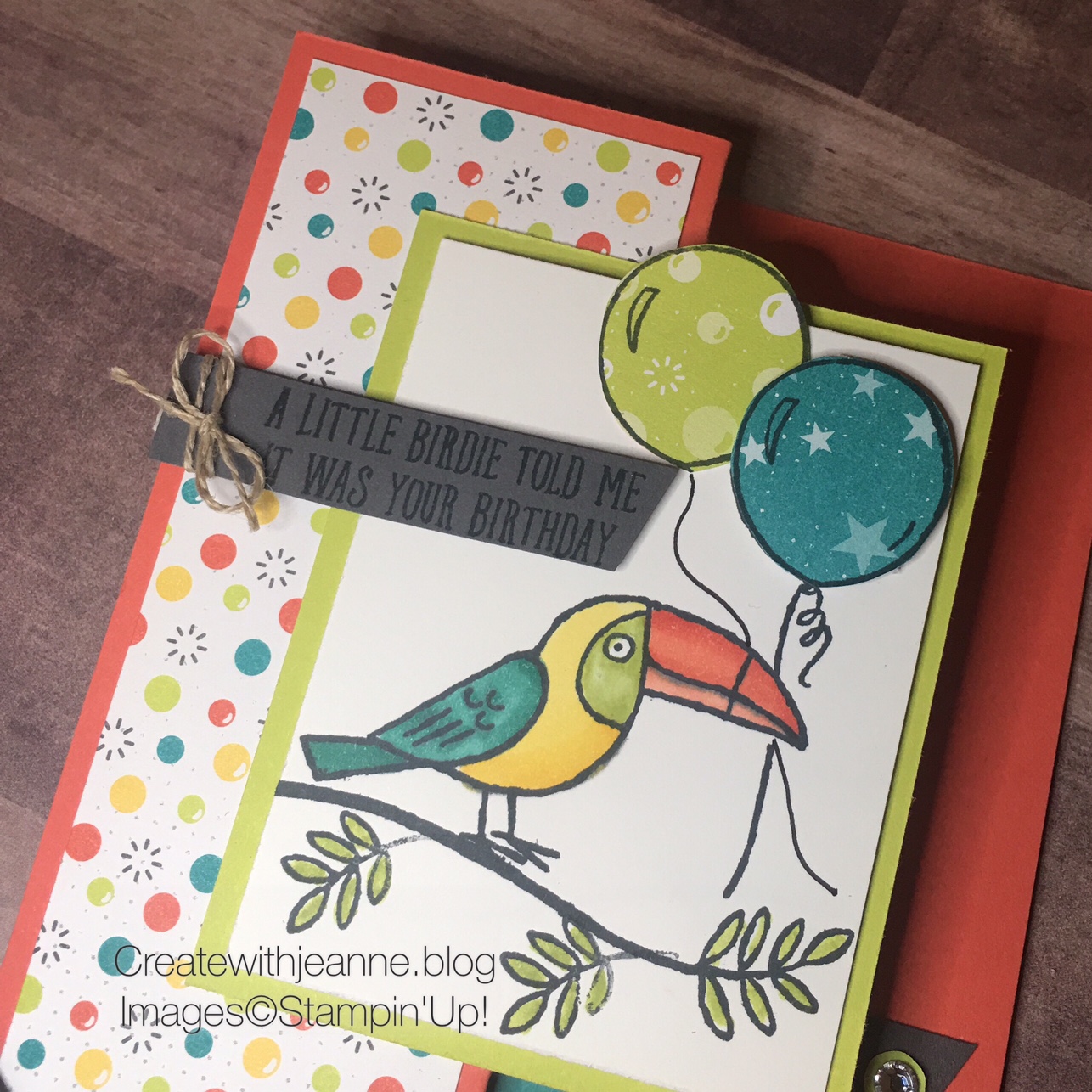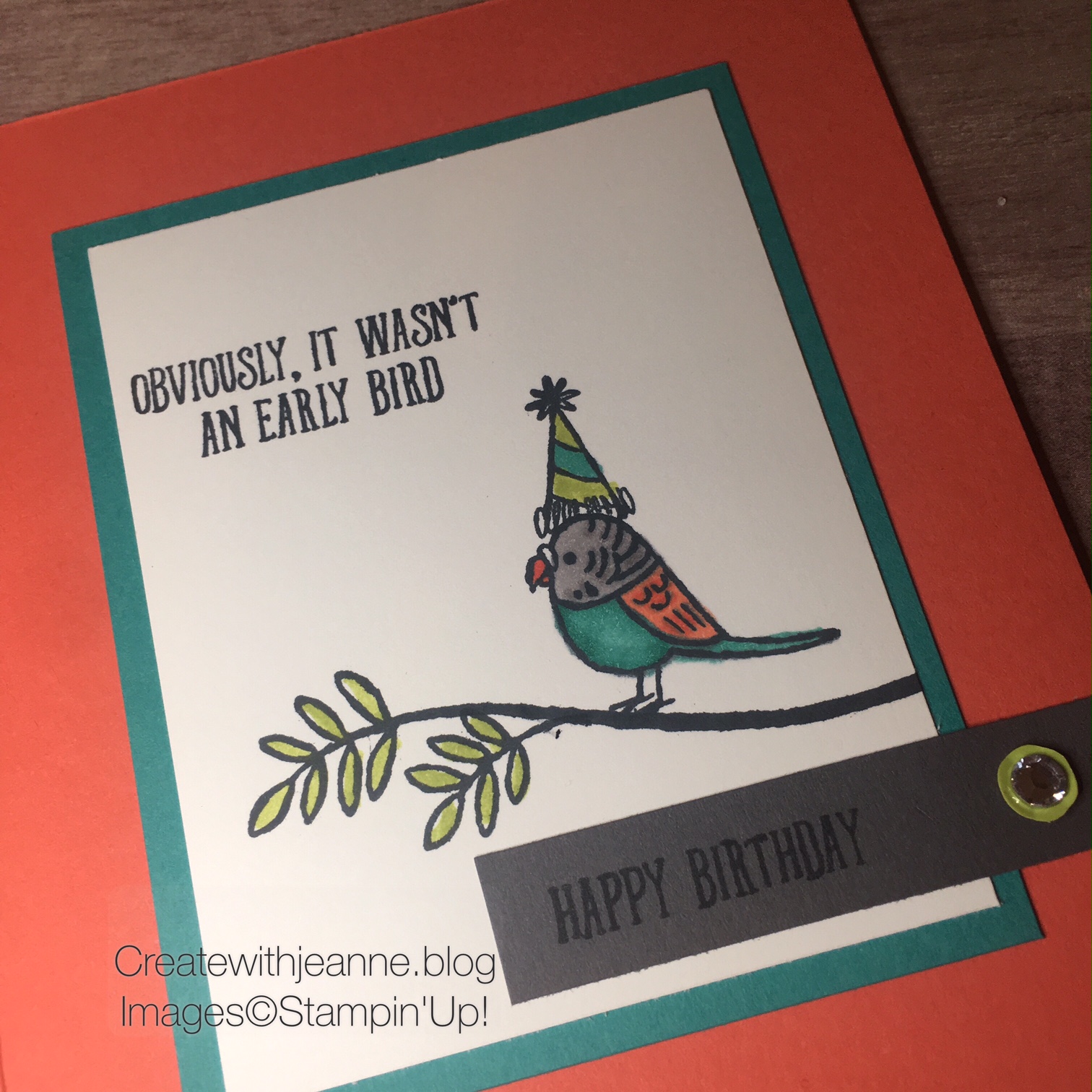 A little birdie told me…..the Bird Banter stamp set is one you may have passed by in the Occasions Catalog (check page 42) I would have too but at the last On Stage event for Stampin’ Up! Demonstrators Brian King demonstrated a card that sold me. Now 4 months into the Occasions Catalog I decided to see what I could come up with. This fun card is perfect if you happen to be a little late on sending birthday cards….or if you are on the ball just leave out “obviously, it wasn’t an early bird”. I am sure with all the great bird images you will be creating all sorts of fun cards.